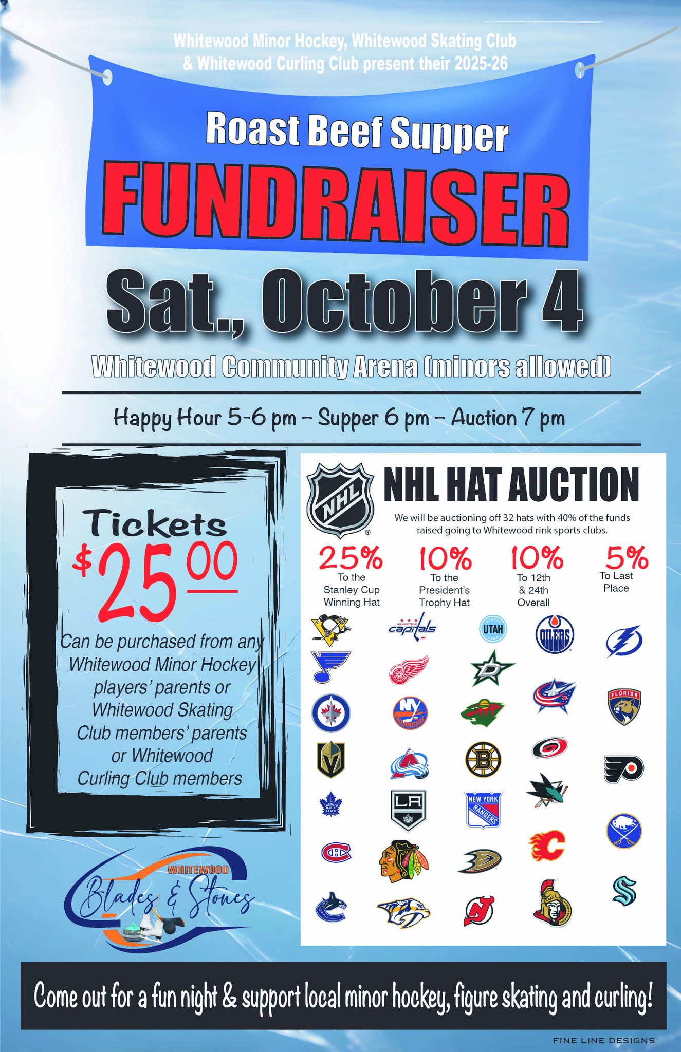 Roast Beef Supper Fundraiser by Blades & Stones Posted on September 9, 2025 by Whitewood-AssistantAdmin Calendar Add to Calendar Add to Timely Calendar Add to Google Add to Outlook Add to Apple Calendar Add to other calendar Export to XML When: October 4, 2025 @ 4:00 pm – 9:00 pm 2025-10-04T16:00:00-06:00 2025-10-04T21:00:00-06:00 Where: Whitewood Community Arena